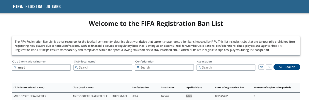 FIFA imposed a three-year transfer ban on Amedspor on October 8.