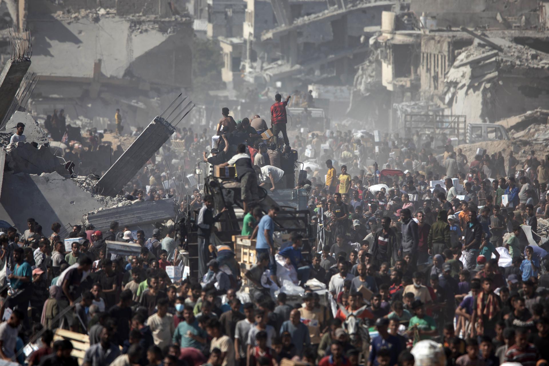 Palestyńczycy odbierają pomoc z ciężarówki, która dotarła do Chan Junis w Strefie Gazy. Zdjęcie: EFE