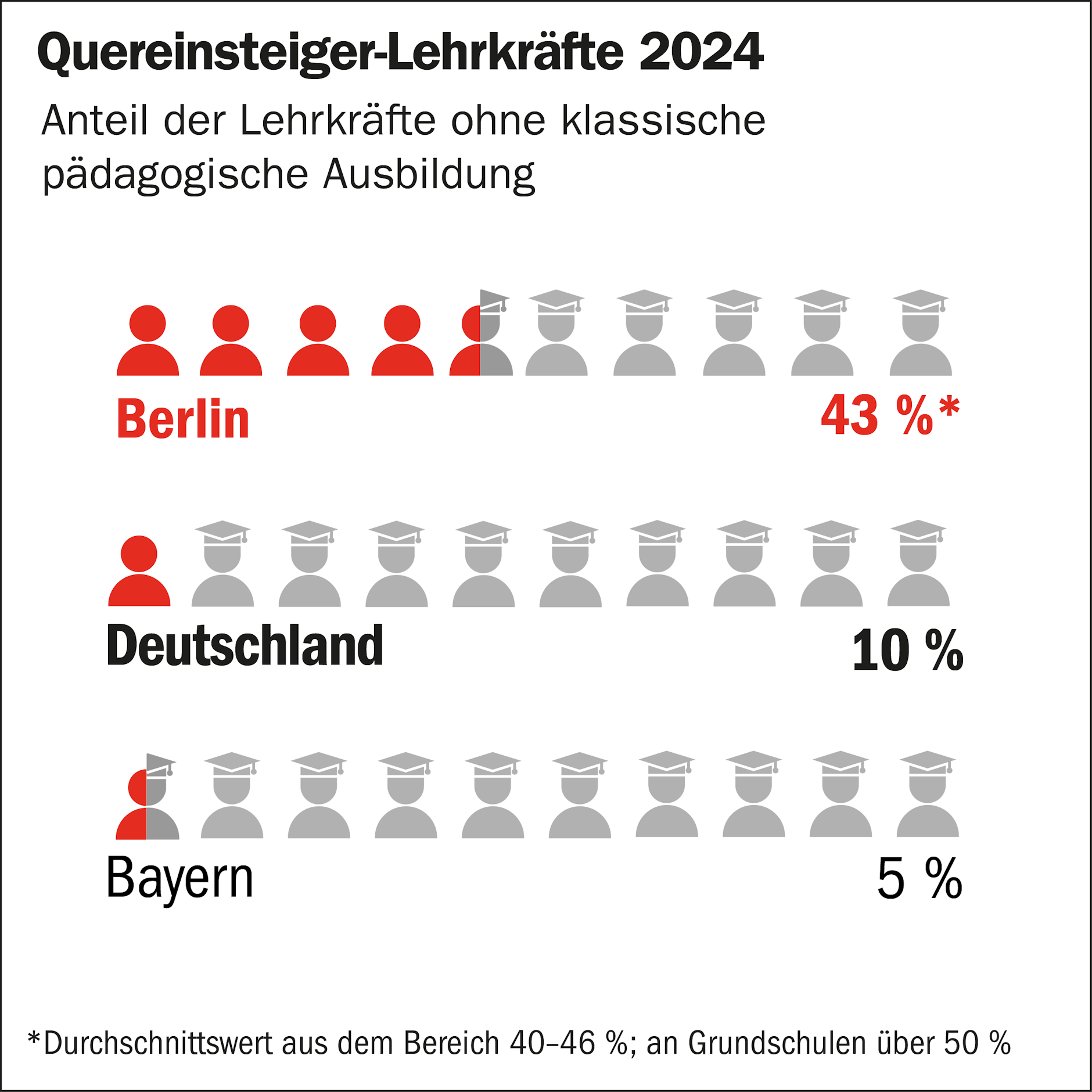 Во-вторых, квалификация персонала имеет решающее значение. Берлин, как и многие земли, годами полагался на людей, меняющих профессию, чтобы заполнить пробелы. Школы с высоким процентом детей из малообеспеченных семей нанимают вдвое больше людей, меняющих профессию, чем школы с более высоким процентом учащихся из обеспеченных семей, и число этих неблагополучных школ в Берлине постоянно растет. Результат: нестабильное качество преподавания и высокий спрос на профессиональное развитие, который школы, находящиеся под давлением, едва могут удовлетворить. Статистика последних лет подтверждает рост доли вновь нанятых учителей в Берлине, которые не имеют полной квалификации. Основная проблема: без обязательного подготовительного обучения, наставничества и обучения на рабочем месте количество ставится в приоритет в ущерб качеству, что усугубляет тенденцию к снижению. Учителей приходится набирать на рынке труда, при этом уникальная особенность заключается в том, что земля Берлин (и другие земли) отвечает как за спрос, так и за предложение. Земли определяют задачи, которые должны выполняться, и необходимое количество персонала (расписание, размер класса, часы обучения). Федеральные земли готовят учителей; Они определяют количество мест в университетах, объём и продолжительность обучения, а также отбор преподавателей. Штаты могли бы контролировать этот процесс и спрос, однако они этого не делают. Вместо этого они создают дефицит, предоставляя слишком мало мест для подготовки учителей, что приводит к увеличению расходов: более высокой договорной заработной плате или практике предоставления статуса госслужащего. Однако предоставление статуса госслужащего является серьёзной ошибкой по двум причинам: оно свидетельствует о неправильной мотивации. Учителями хотят стать не только лучшие специалисты, потому что это привлекательная профессия, но и те, для кого важнее всего стабильность работы. Чисто коммерческий подход к предоставлению статуса госслужащего — это ловкий ход, который перекладывает проблему взносов в систему социального обеспечения на пенсионное обеспечение. Это обременяет будущие бюджеты.