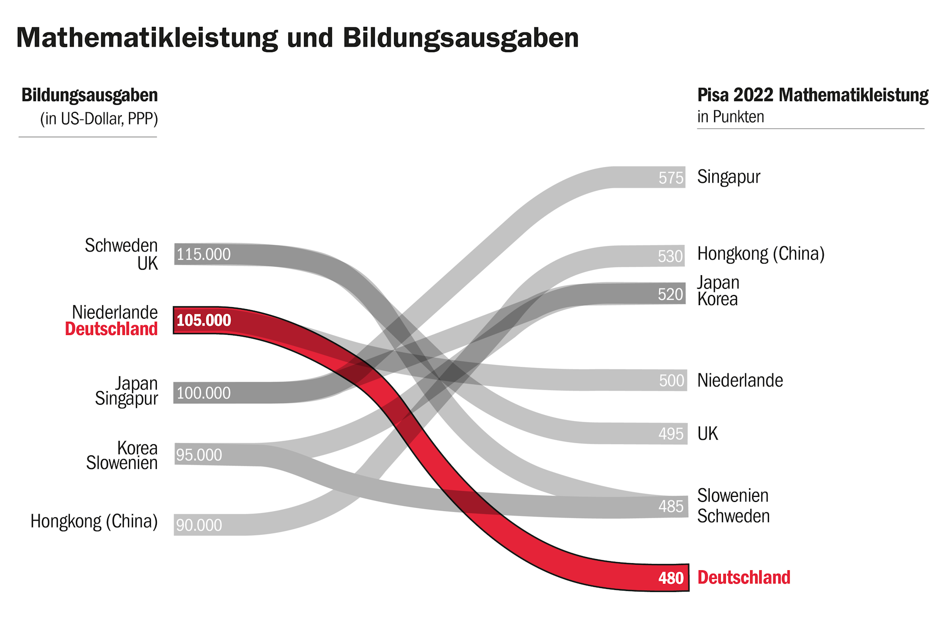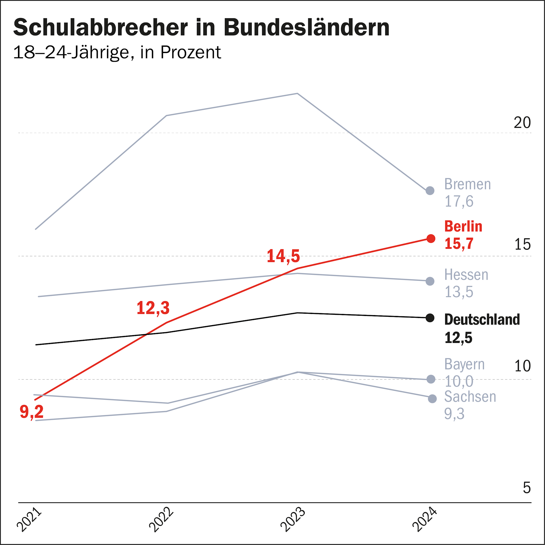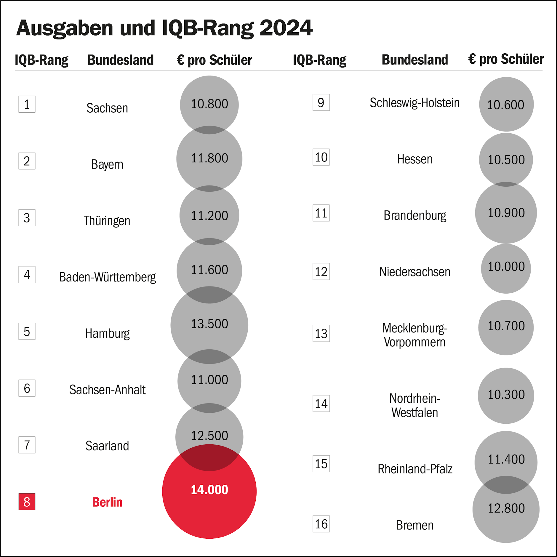 Согласно предварительным государственным данным и анализу СМИ, Саксония уже много лет тратит значительно меньше на душу населения, чем Берлин, но при этом стабильно достигает более высоких уровней компетентности в общенациональных сравнительных исследованиях. IQB Trend 2022 (достижение образовательных стандартов Постоянной конференции министров образования и культуры по математике, биологии, химии и физике в младших классах средней школы) подтверждает, что снижение успеваемости особенно сильно сказывается на столице, особенно в области естественных наук.