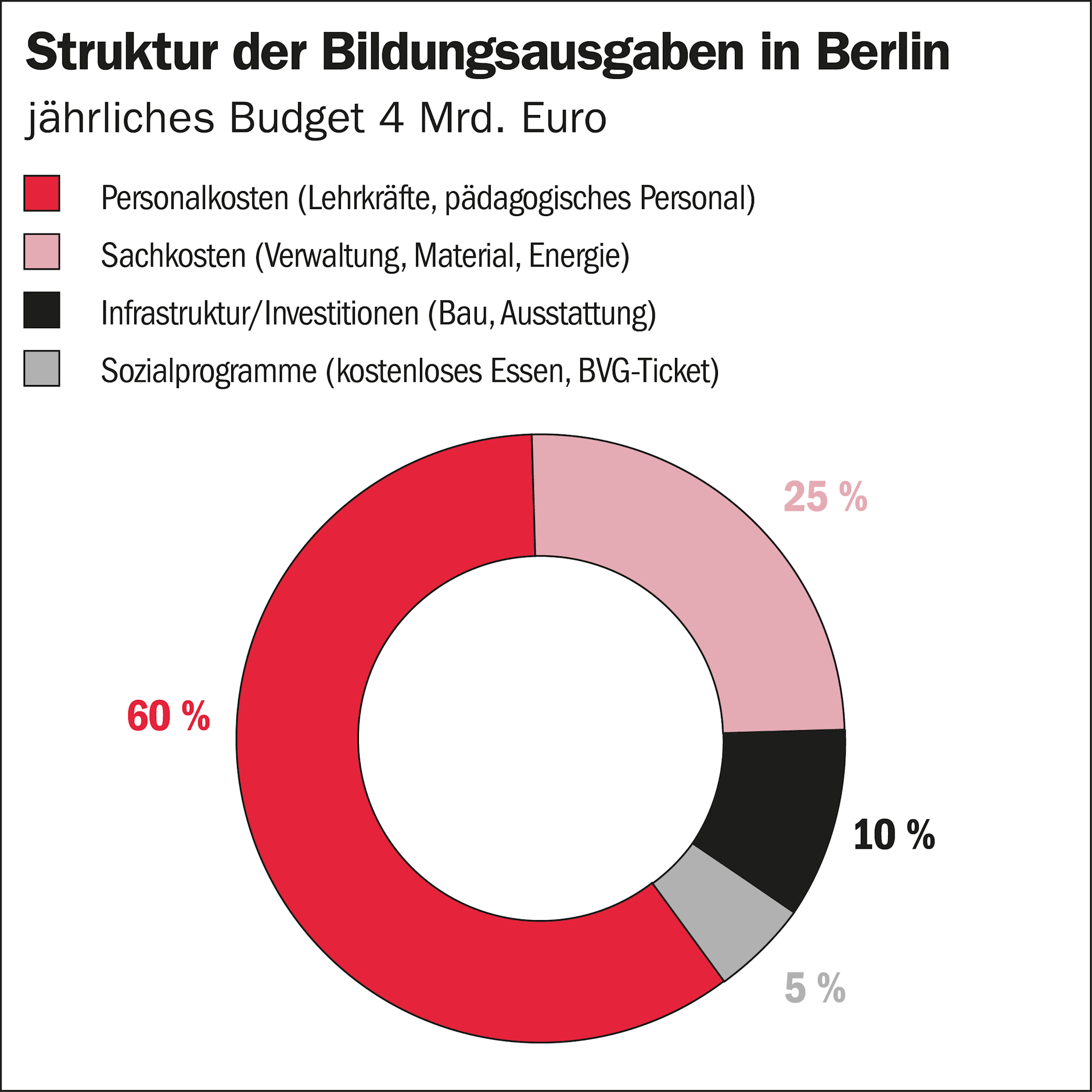 Результаты берлинской системы образования – яркий пример полной противоположности успешной социальной политике: расходы не только высоки в абсолютном выражении, но и растут годами, не приводя к реальному улучшению результатов или расширению образовательных возможностей для берлинских детей. Расходы на персонал составляют примерно 60% бюджета образования, а остальная часть распределяется на текущие административные и материальные расходы (25%), инвестиции, такие как строительство школ (10%), и социальные программы, такие как бесплатное школьное питание и бесплатные проездные на общественный транспорт (5%). Не существует простой корреляции между принципом «больше денег – лучше результаты». Серьёзной проблемой берлинской системы образования является чрезмерное администрирование, бюрократия и отсутствие цифровизации. Потери, вызванные отсутствием или неэффективностью цифровизации, сложно оценить количественно, поскольку они затрагивают все составляющие расходов в берлинском бюджете на образование. Здесь растрачиваются ресурсы, которые так необходимы каждому учащемуся.